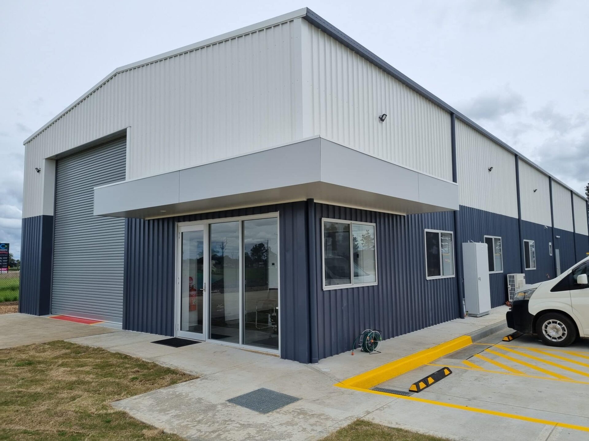we achieved this in a very cost effective manner using 2 Tone Wall cladding and a simple architecural awning to office.