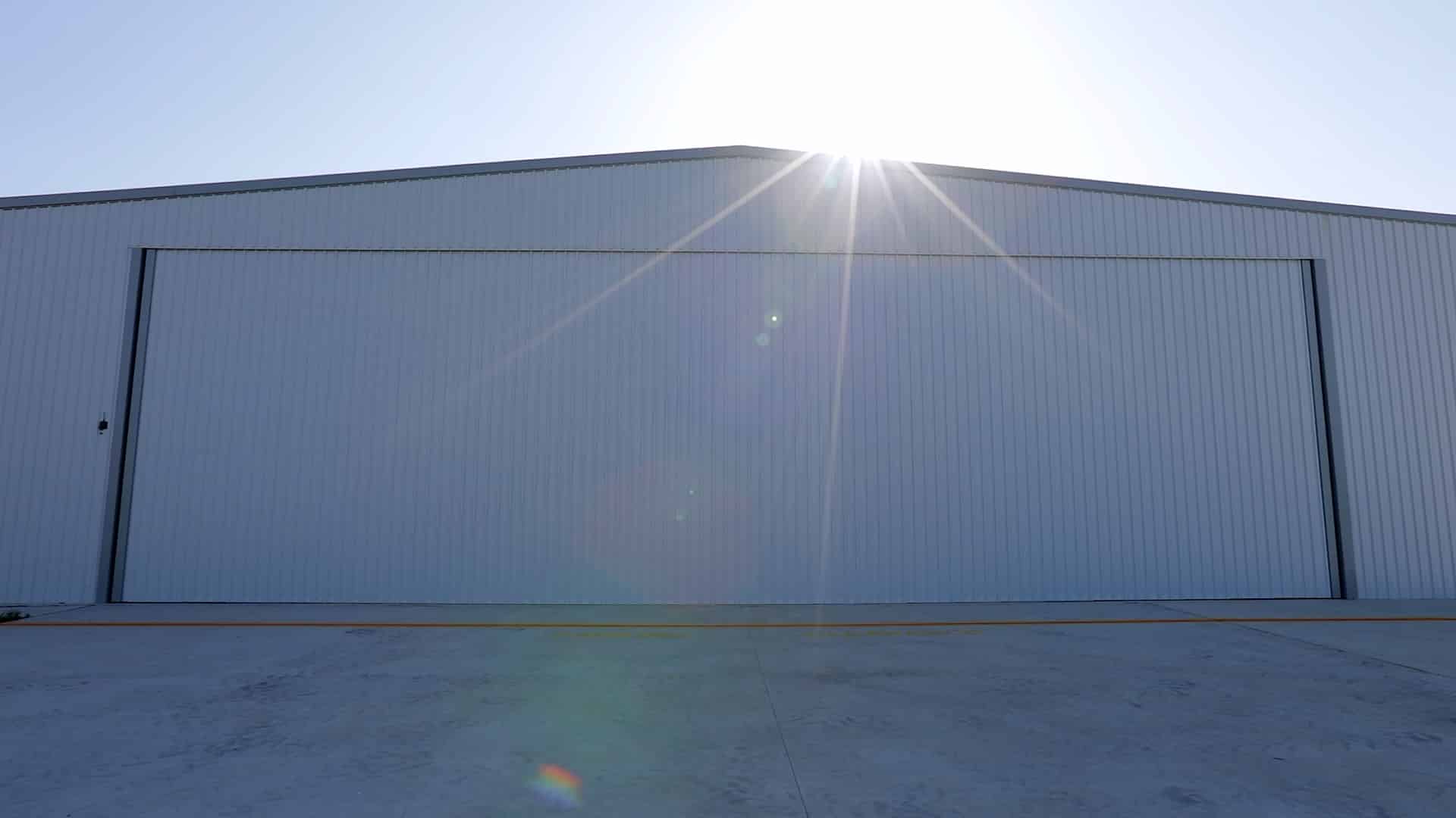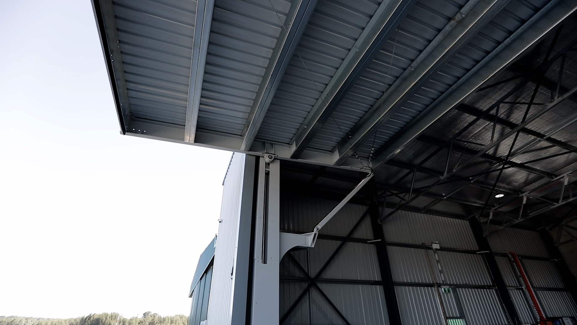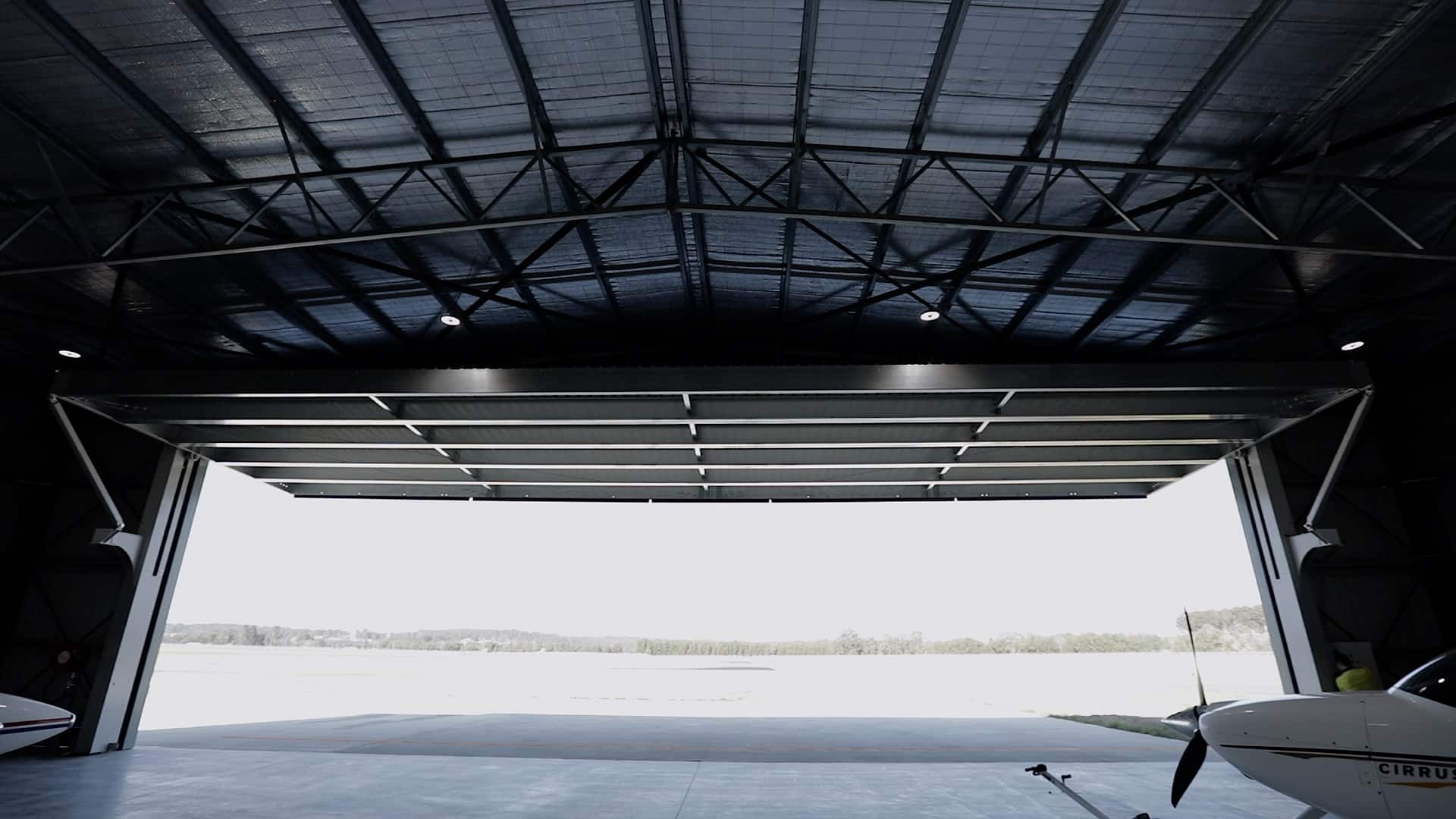 The client had a few specific requirements including a 6 metre office and amenities building, precast concrete fire separation wall between the office and main hangar to meet building codes, structural support for a large on roof solar system and an automated door solution that would enable direct access to the airport runway, maximum accessibility/clearance for their aircraft and remote operation.