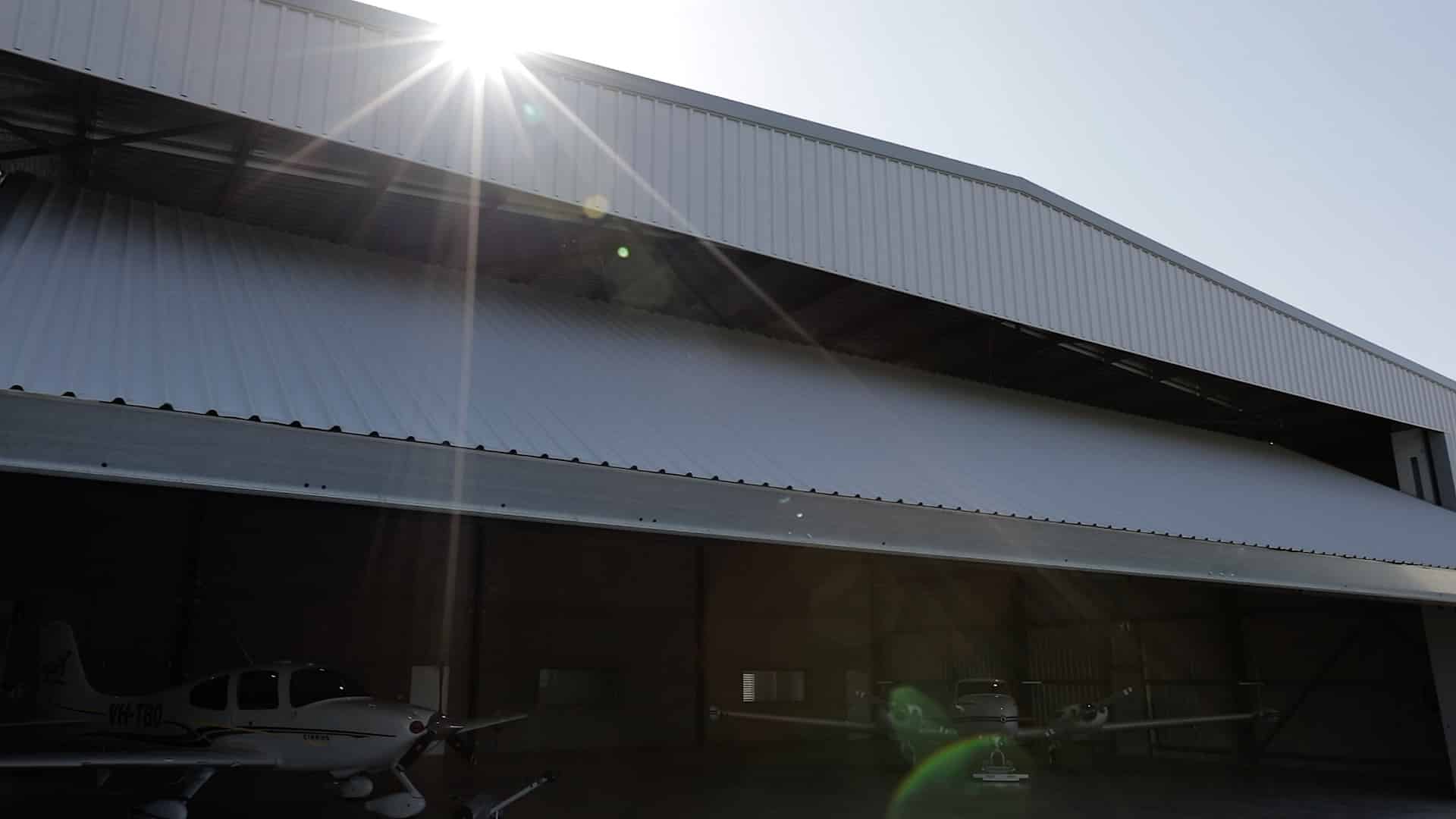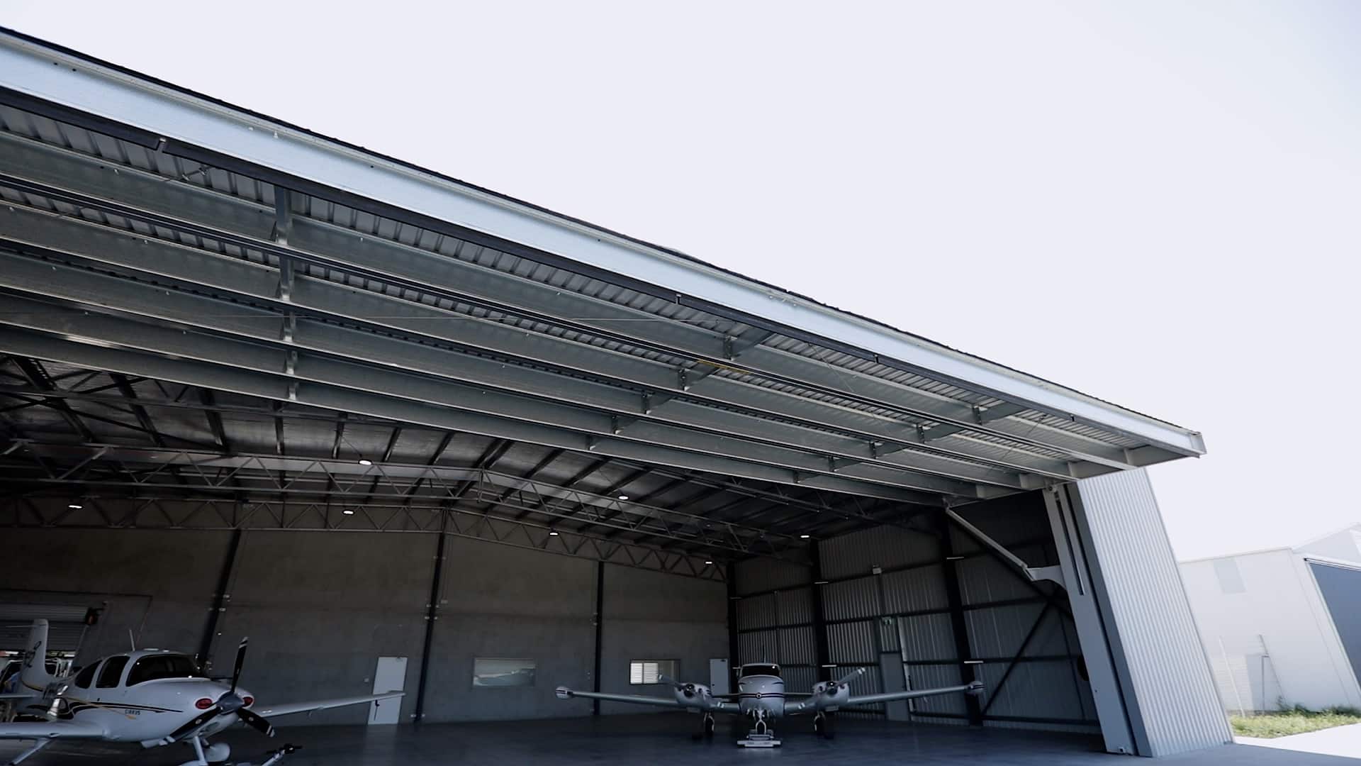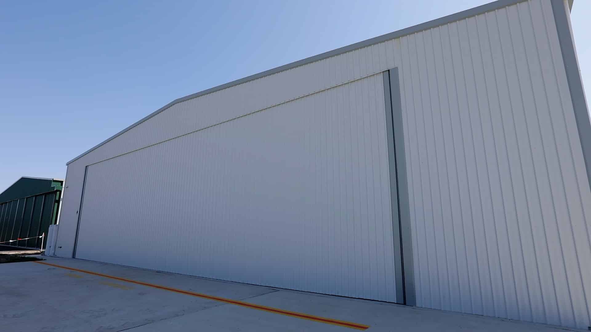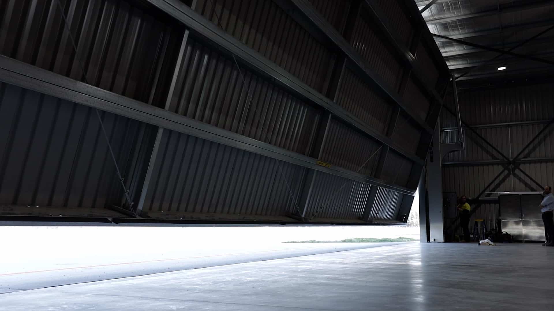 The client had a few specific requirements including a 6 metre office and amenities building, precast concrete fire separation wall between the office and main hangar to meet building codes, structural support for a large on roof solar system and an automated door solution that would enable direct access to the airport runway, maximum accessibility/clearance for their aircraft and remote operation.
