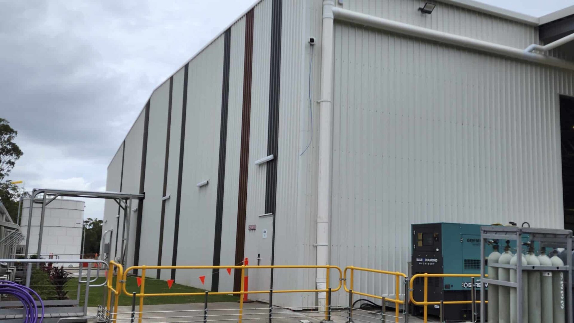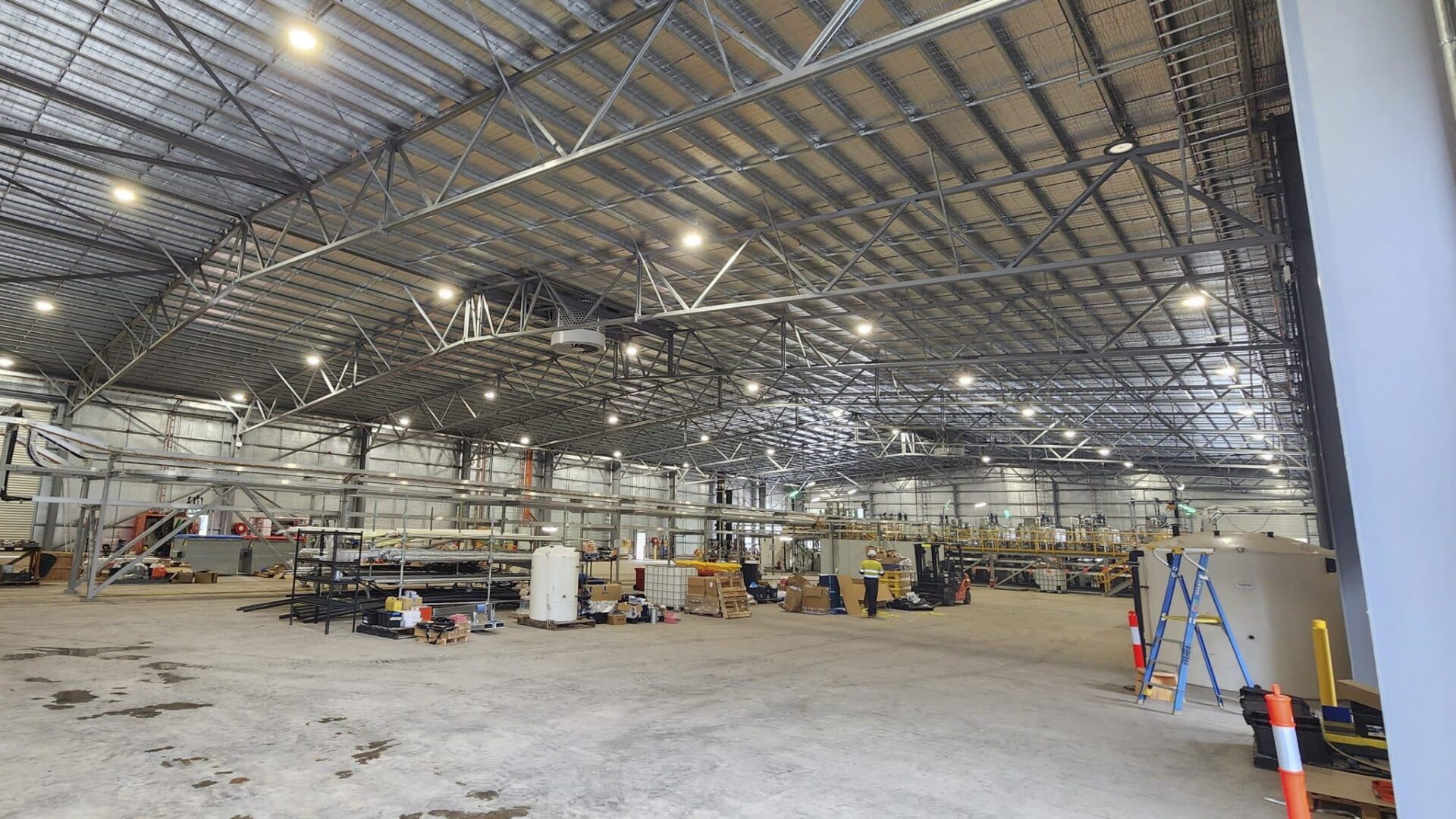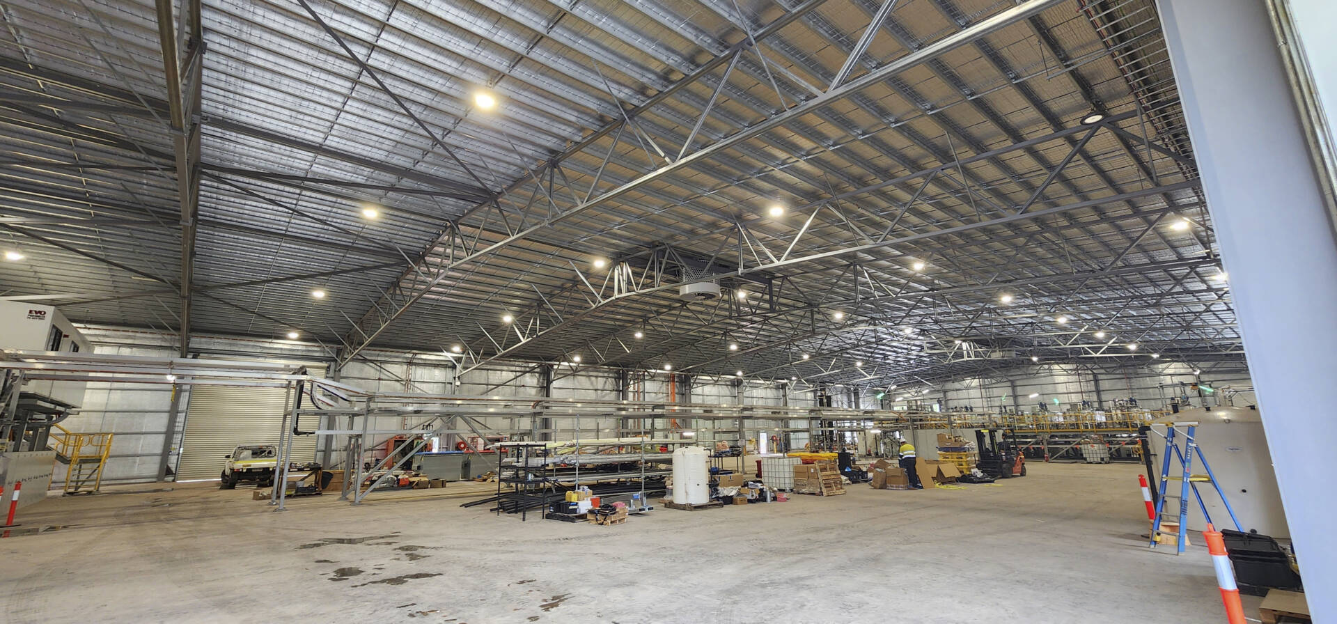 The main structure of the building consisted of a structural steel frame including 40m roof spans that required no centre column support – maximising the usable floor area and accessibility around the plant.