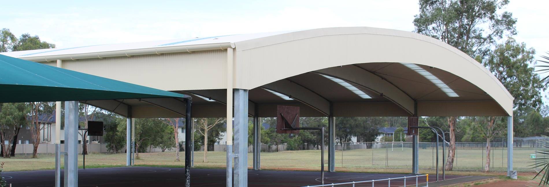 The customer needed a large covered outdoor learning area for a double basketball court.