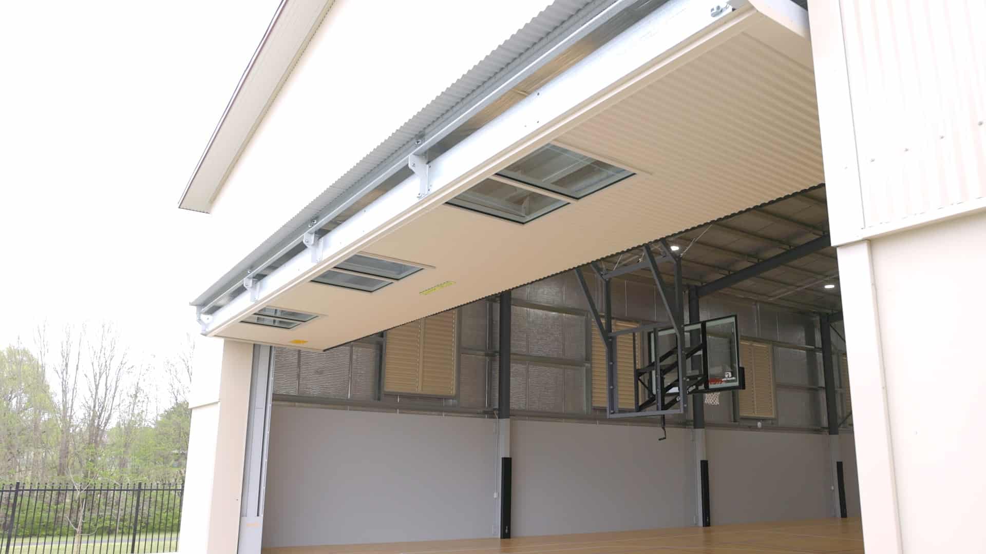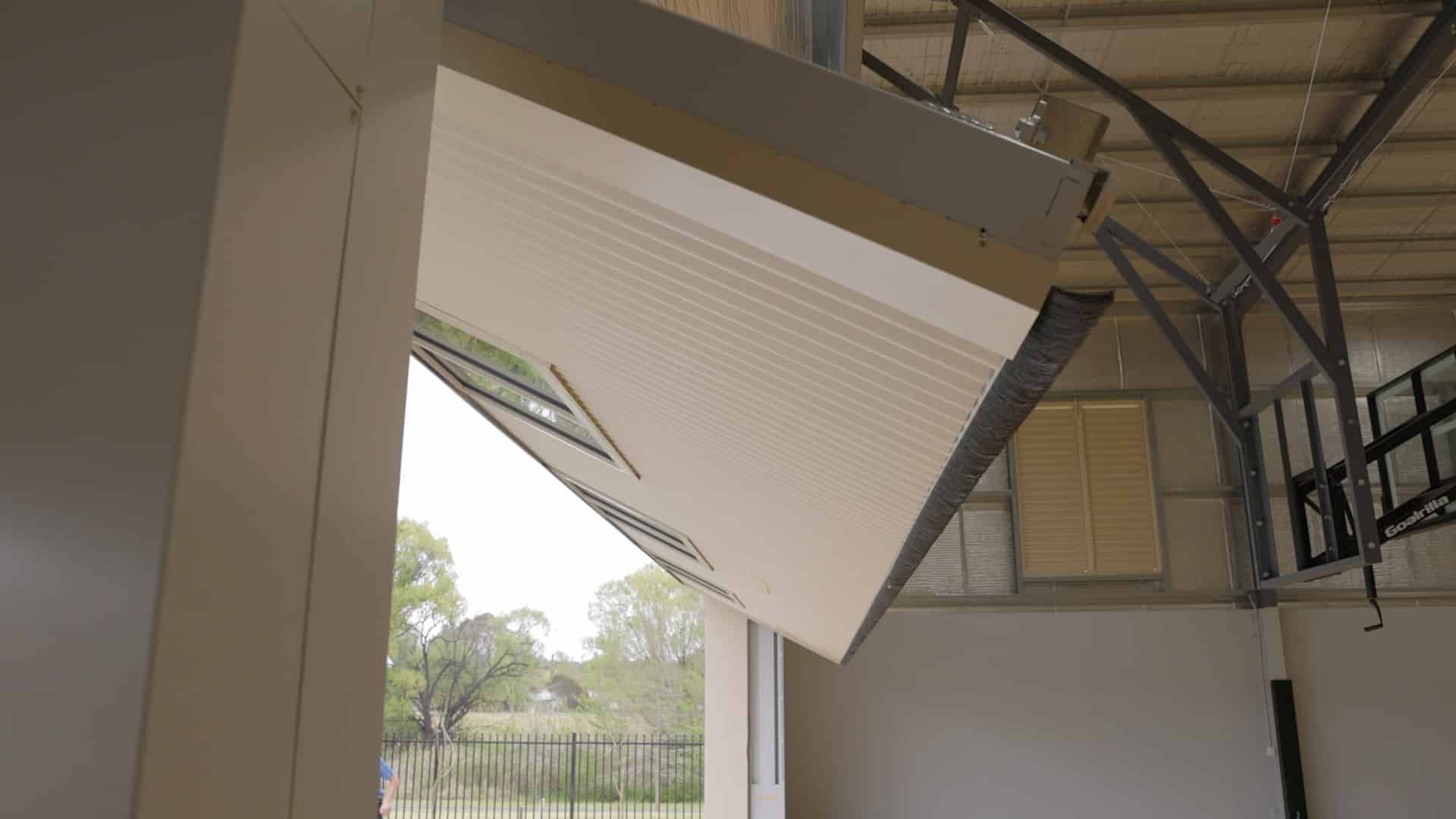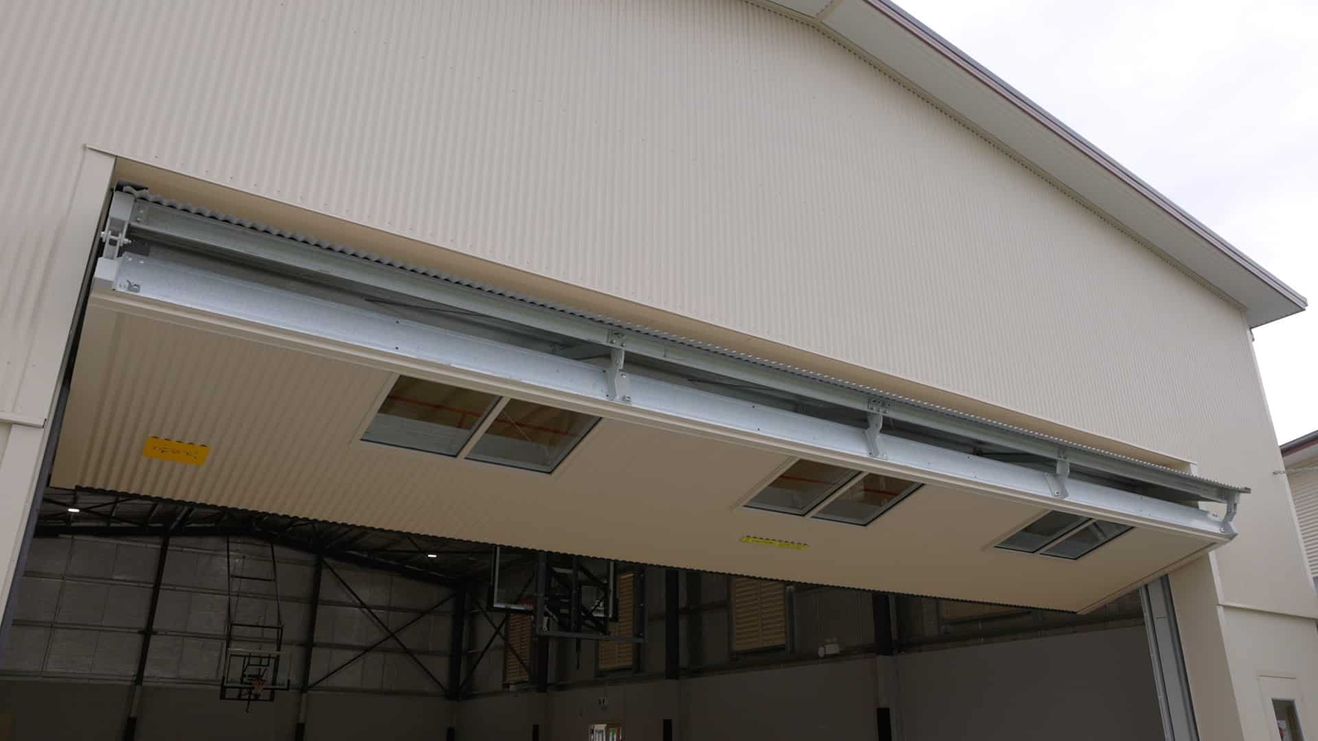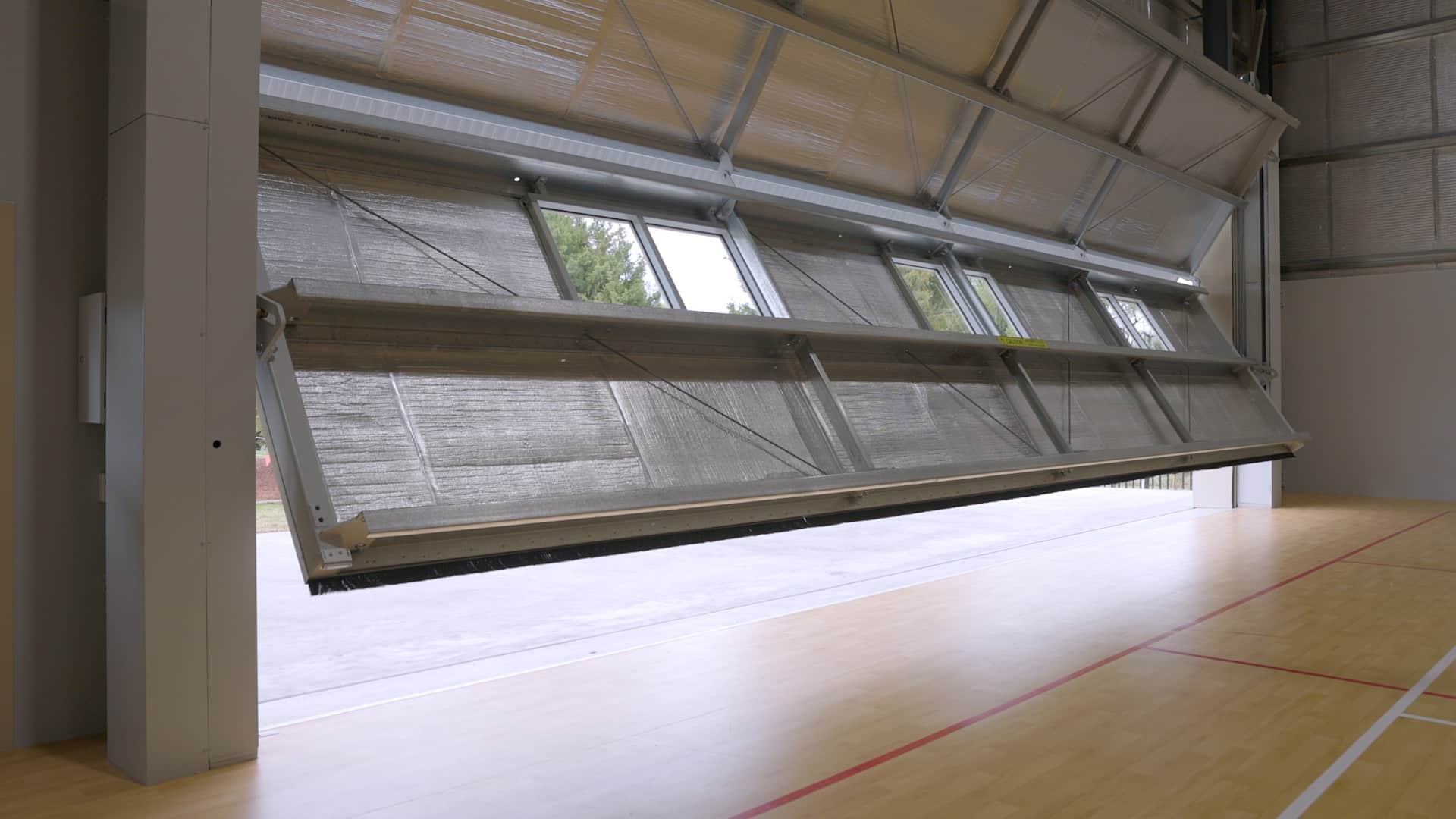 Installed to the school yard end of the hall, this door features remote control operation, inset windows for maximum visibility and natural light, rubber and brush seals to minimise weather ingress and is finished in the same cladding colour and profile as the main building for a seamless aesthetic.