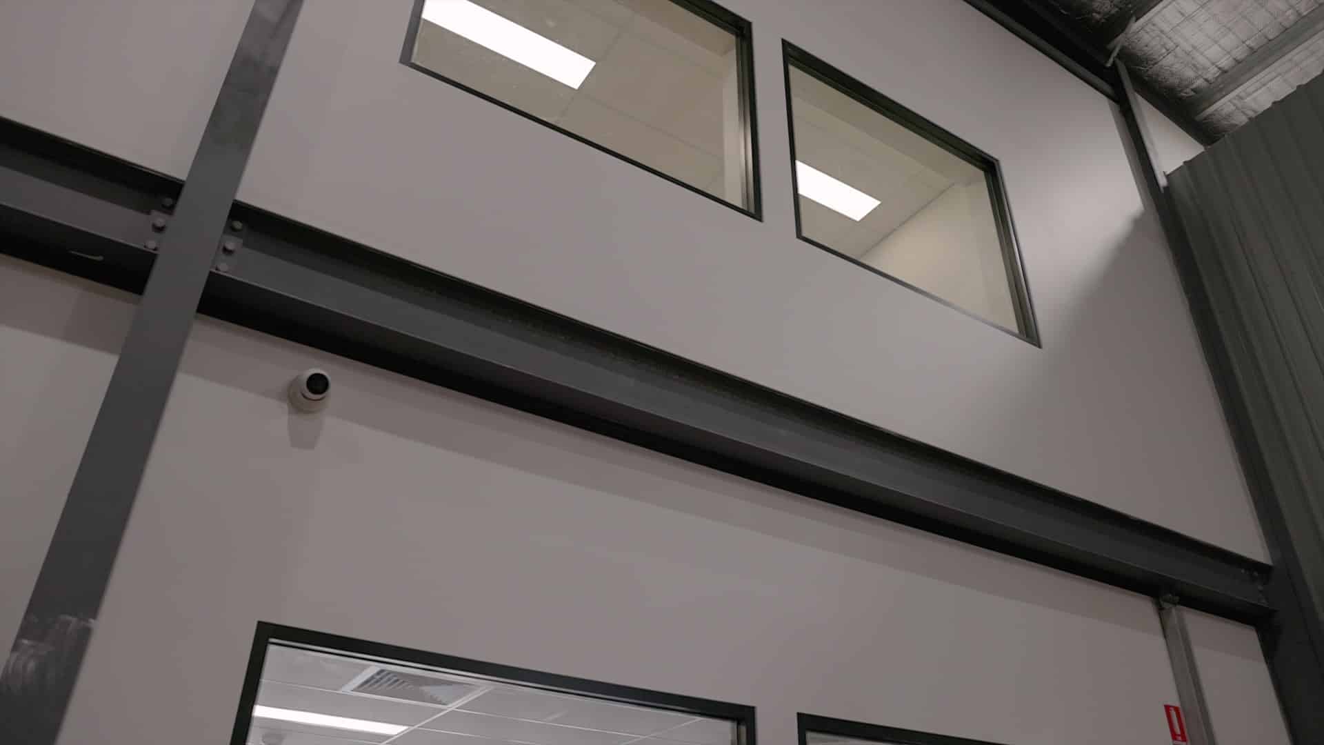 Separating the office and rear warehouse is a large precast concrete wall which assists with fire safety compliance, and features inset windows to allow visibility from the office to the warehouse.