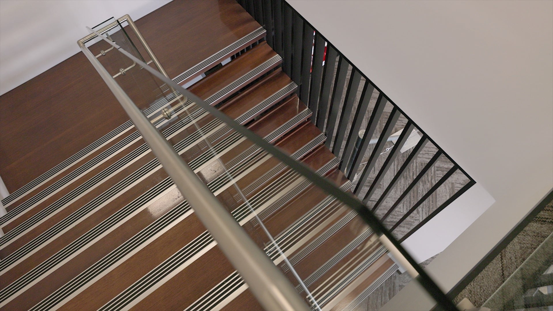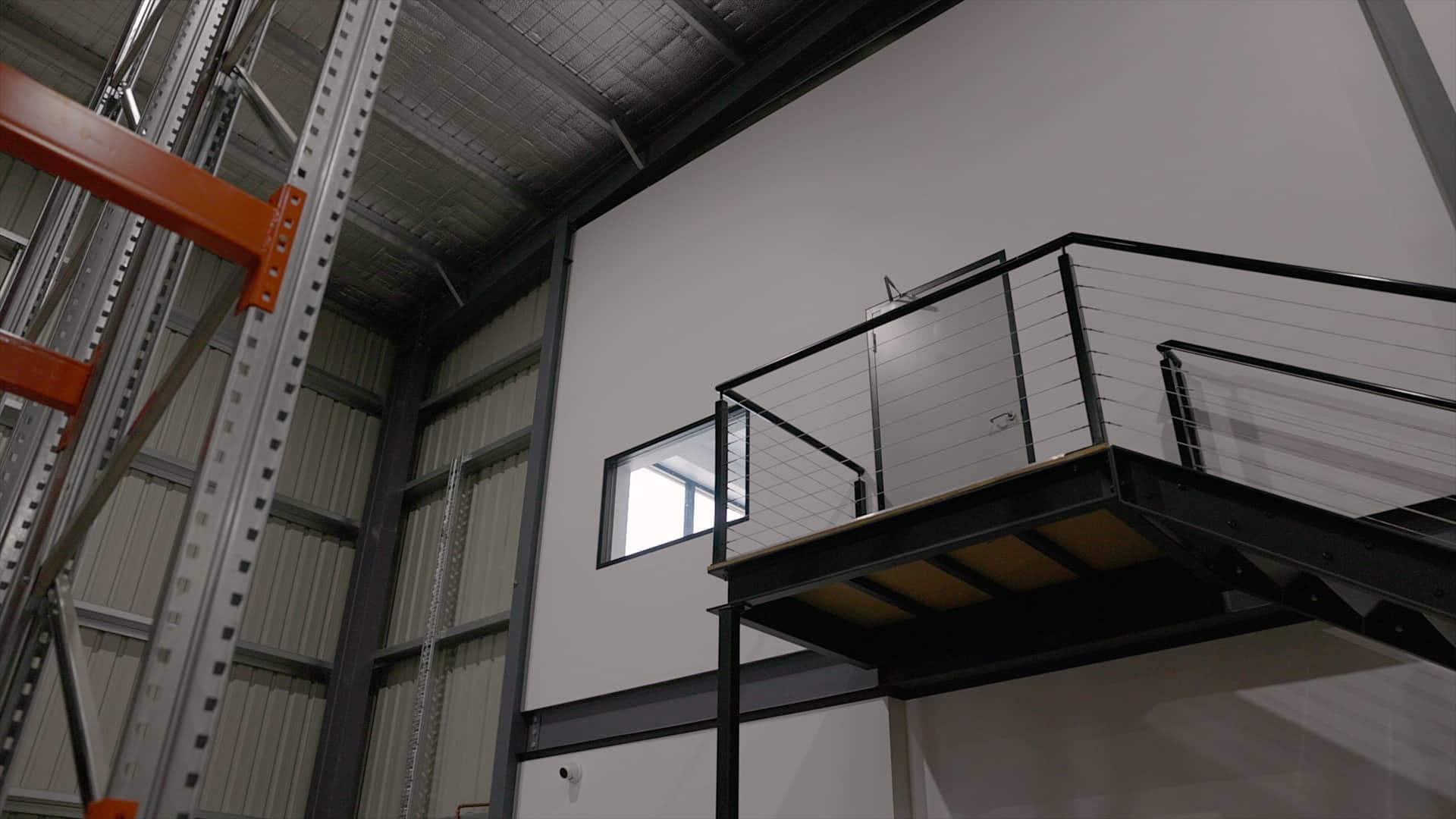 Access to the warehouse from the second level of the office is made possible via a custom stair case.
